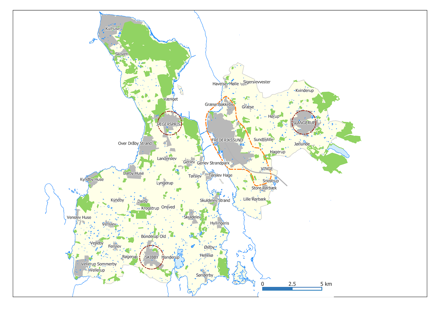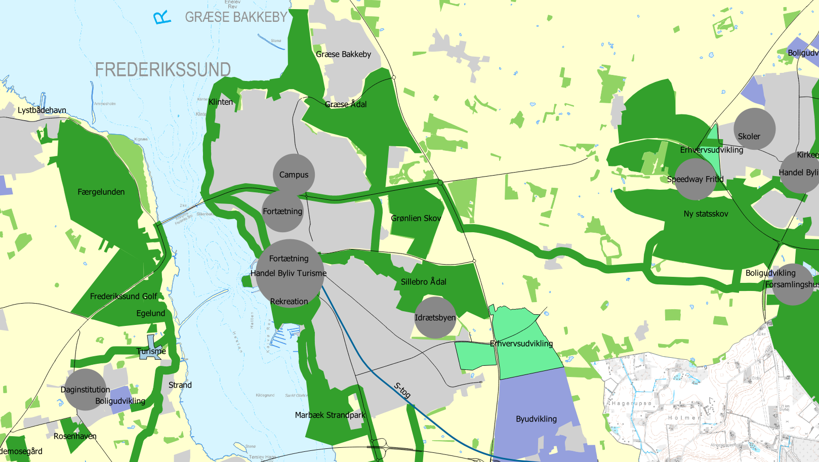 Den røde tråd i udviklingen af vores byer er, at de udover at være gode rammer for hverdagslivet skal fremme fællesskaber, så byerne giver de bedst mulige betingelser for borgernes sociale liv. Kommunen fremmer det gode liv i byerne ved at arbejde for, at hverdagens aktiviteter bliver udgangspunkt for møder indenfor og mellem generationerne. Handel, uddannelse, kultur og idræt skal lokaliseres, så det understøtter det sociale liv i byerne. Samtidig skal byerne give adgang til bynær natur og give gode muligheder for at borgerne kan bruge de naturskønne omgivelser i hele kommunen. Naturen udgør fundamentet i kommunens identitet og tiltrækningskraft. Den inviterer til bevægelse i hverdagen, gør kommunen attraktiv for byudvikling og er samtidig en vigtig basis for kommunens turismeudvikling. Vores fjorde er værdifulde, både som natur og til rekreativ udfoldelse. I kombination med vores grønne natur har Frederikssund Kommune helt særlige kvaliteter. Det ønskes understøttet ved at skabe flere kystnære muligheder for ophold og styrke kommunens rekreative stier, så adgangen til både det blå og det grønne styrkes.