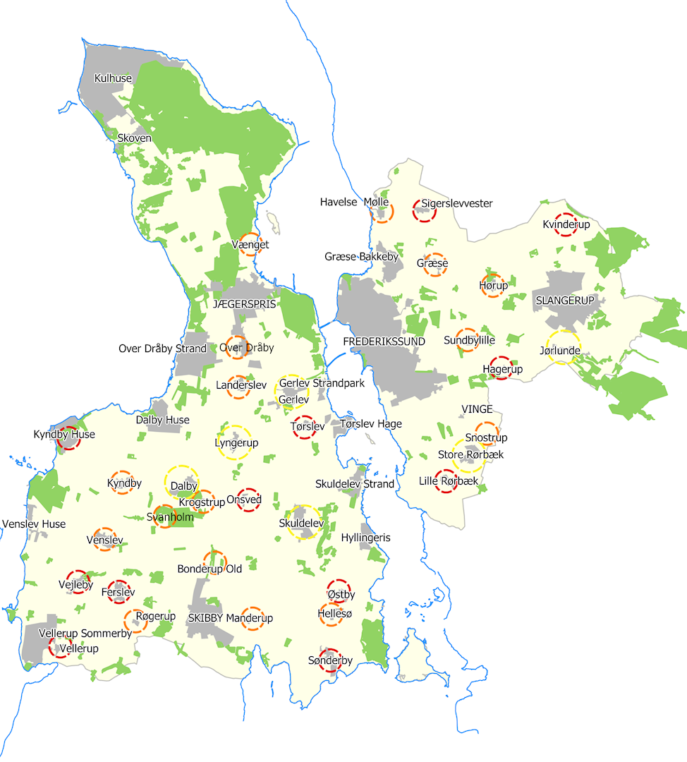 Frederikssund Kommune ønsker at fastholde den enkelte landsbys særlige identitet og kvaliteter, samtidig med at landsbyerne skal kunne følge med tiden. 34 mindre byer i kommunen er registreret som landsbyer med defineret landsbyafgrænsning i kommuneplanen og er vist på ovenstående kort. Byzonelandsbyer er vist med gul ring, landzonelandsbyer med særlige bevaringsværdier - i kommuneplanen kaldet særlige landsbyer er vist med rød ring og øvrige landzonelandsbyer er vist med orange ring.