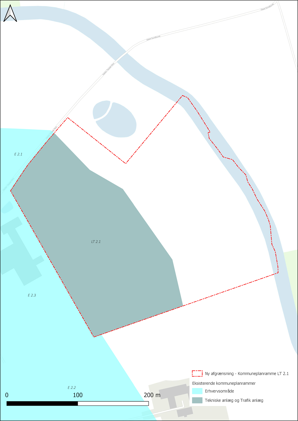Kortbilag 1. Viser et kort over de eksisterende rammeområder og den nye afgrænsning af kommuneplanramme LT 2.1