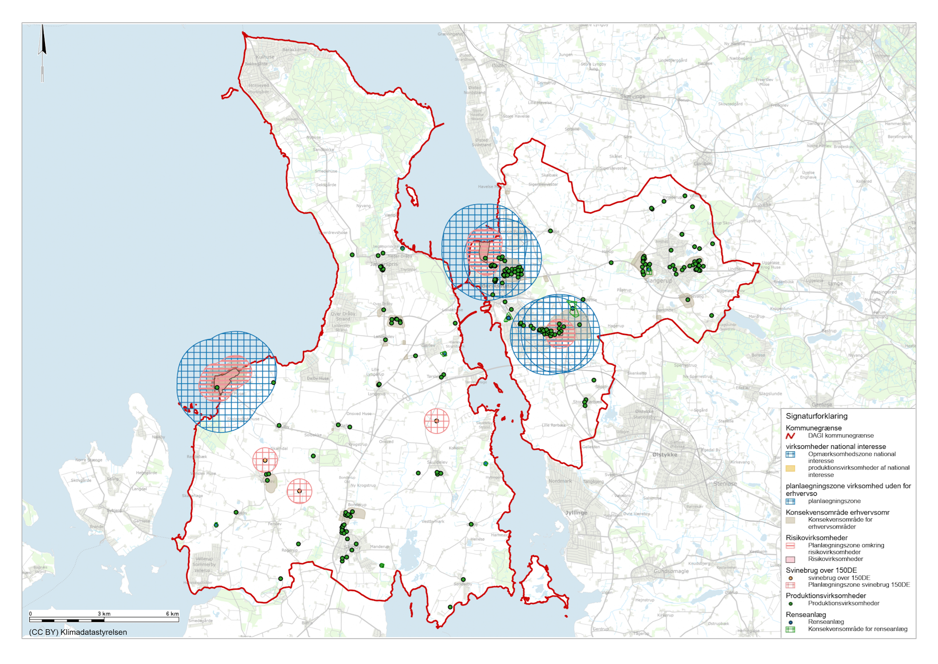 Ved udpegningen af produktionsvirksomheder er benyttet Miljøstyrelsens virksomhedsregister DMA (Digital MiljøAdministration). Terrænreguleringer og jorddepoter uden lugt eller støjkonsekvenser for naboarealer er ikke vist som produktionsvirksomheder og der er ikke vist konsekvensområder omkring disse. På kortet ovenfor kan man slå lag til, der viser produktionsvirksomheder, store svinebrug og renseanlæg. Konsekvensområder omkring støjende fritidsanlæg, vindmøller og militære anlæg kan ses under temaet støjbelastede arealer.