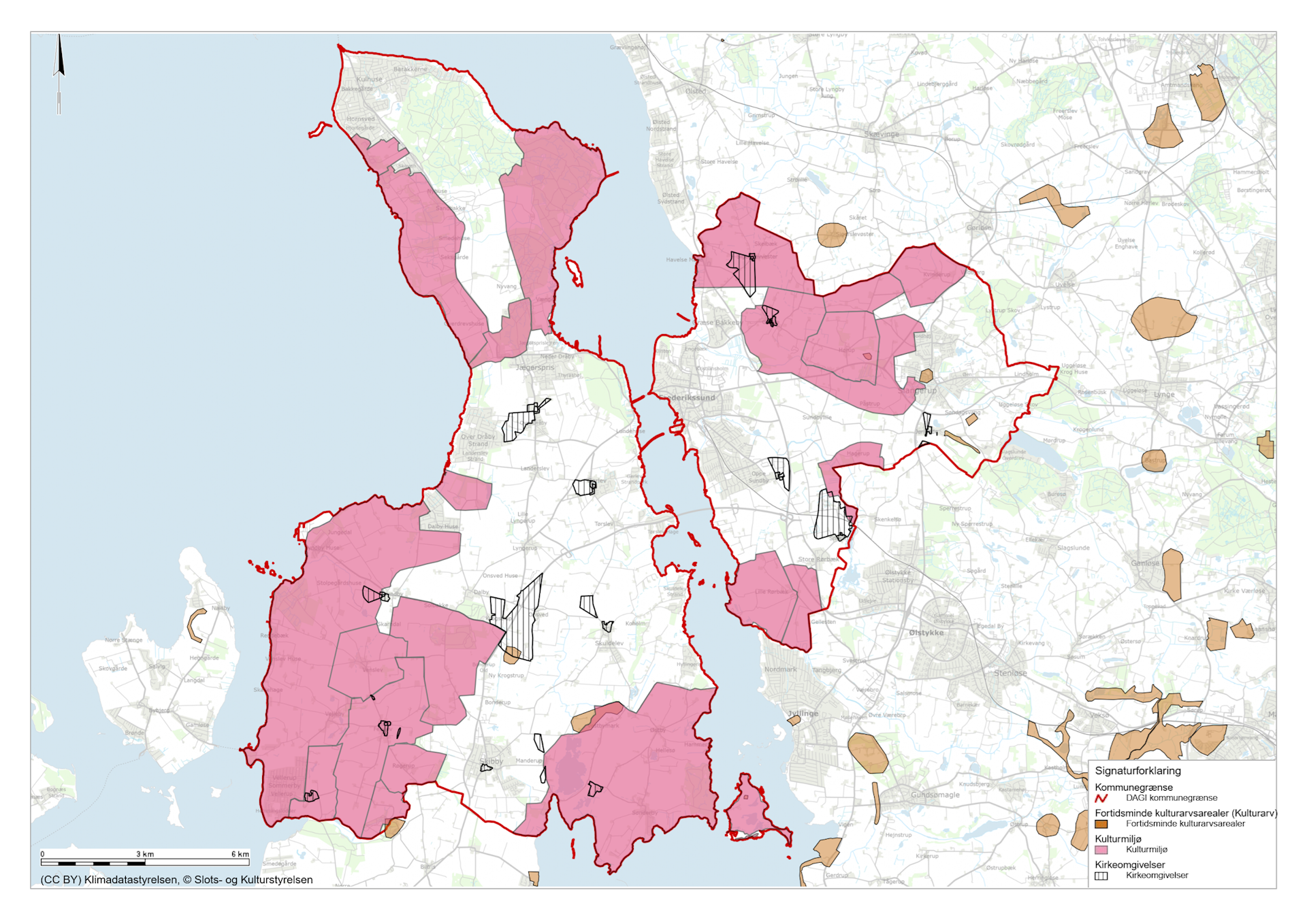 På kortet ovenfor er det muligt også at slå visning af kulturarvsarealer til. Indenfor kulturarvsarealer er der særlig stor sandsynlighed for, at der findes fortidsminder i jorden. Kulturarvsarealer udpeges og administreres af Kulturministeriet og der er ikke knyttet kommunal regulering til dem. Når de kan vises i kommuneplanen, er det for at give potentielle bygherrer viden om, at der er væsentlige fortidsminder i et område, og at det kan være hensigtsmæssigt at tilrettelægge anlægsarbejdet, så fortidsminderne bevares på stedet. Derved kan bygherrens omkostninger til de arkæologiske undersøgelser reduceres.